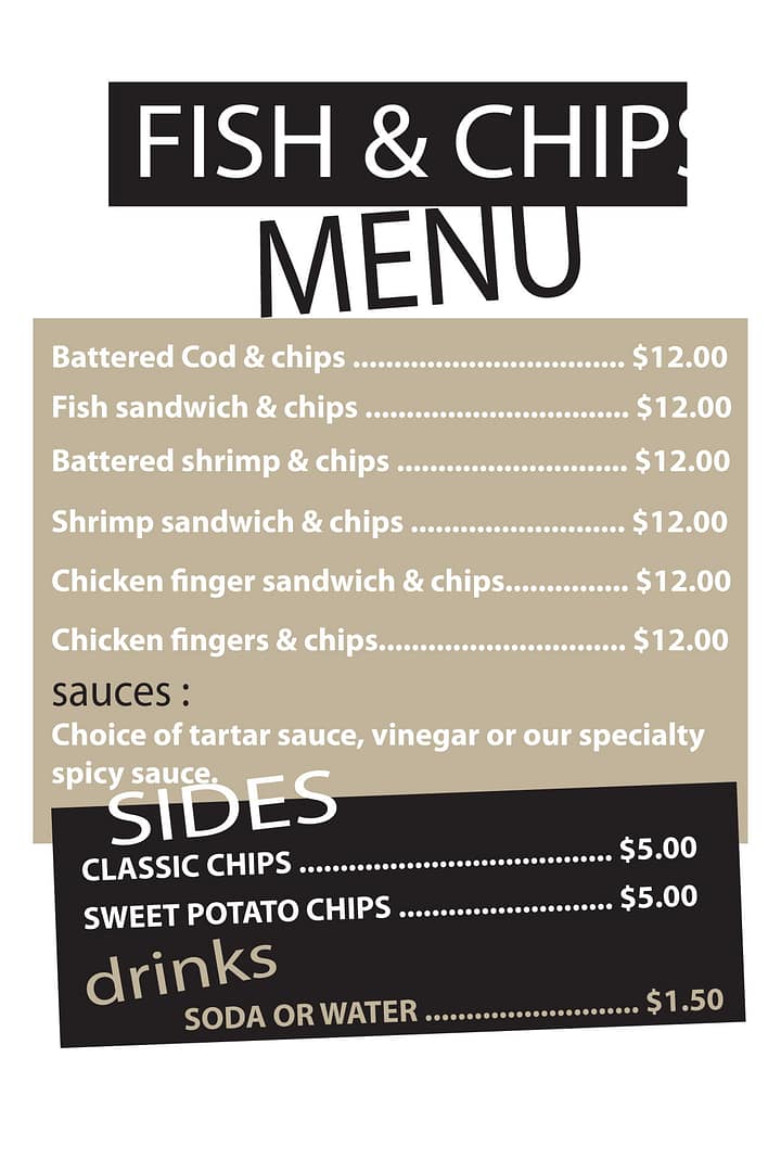 - CHOICE OF TARTAR SAUCE, VINEGAR OR OUR SPECIALTY SPICY SAUCE.