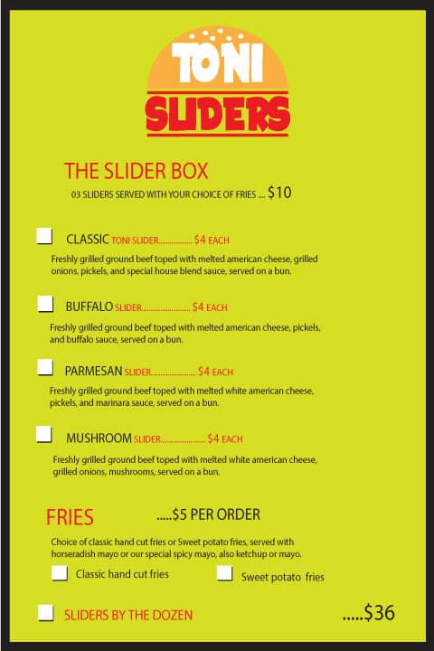 $1003 SLIDERS SERVED WITH YOUR CHOICE OF FRIES.